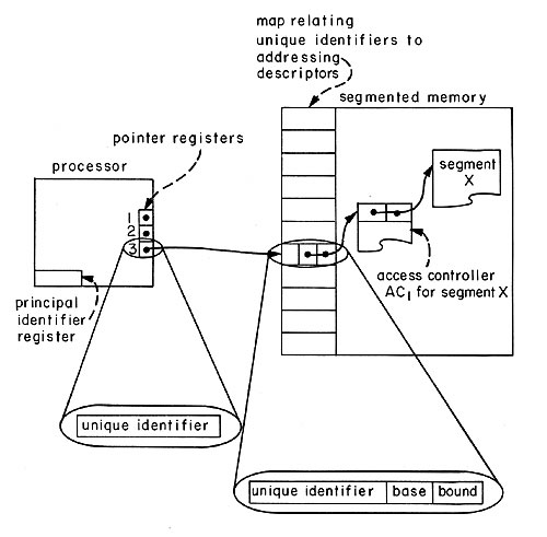 Fig. 9. A revision of Fig. 5, with the addition of an access controller as an indirect address to be used on all references by the processor to the memory. Since the access controller contains permission bits, they no longer need appear in the processor registers, which have been renamed "pointer" registers. Note that the privileged state bit of the processor has been replaced with a principal identifier register.